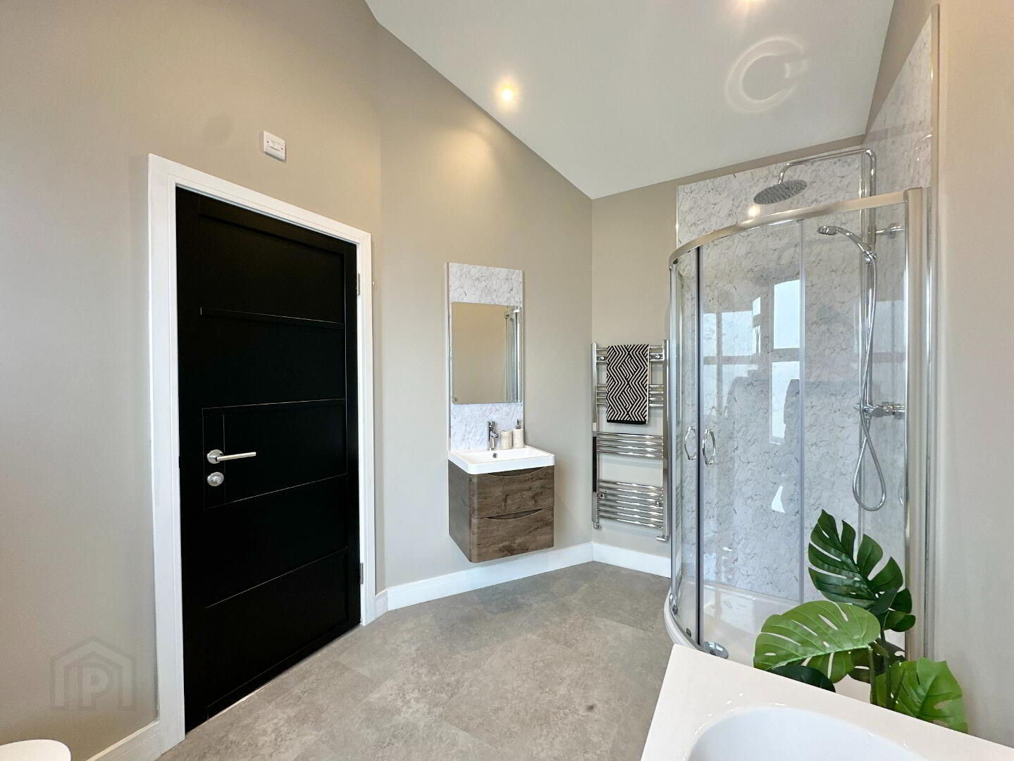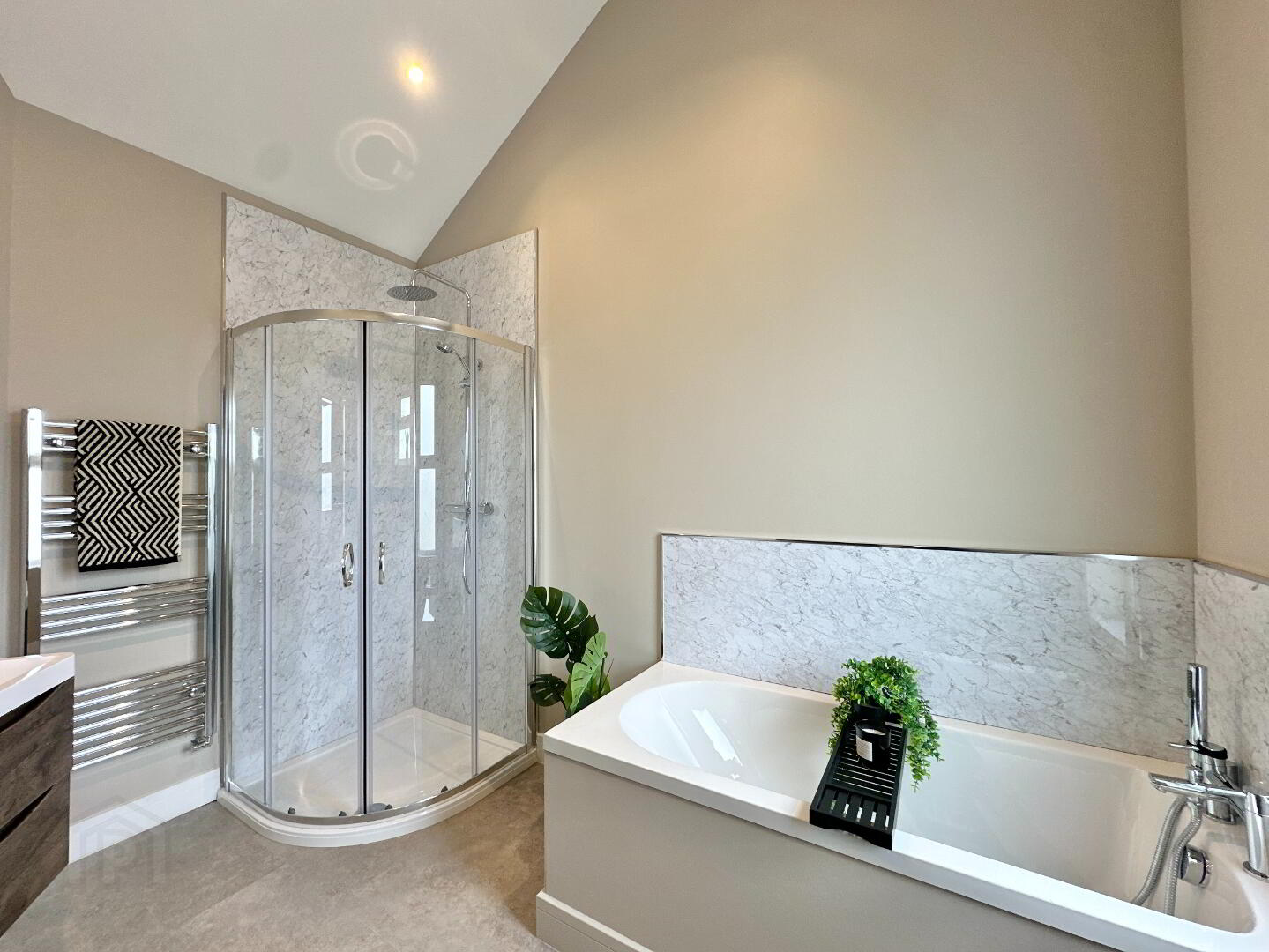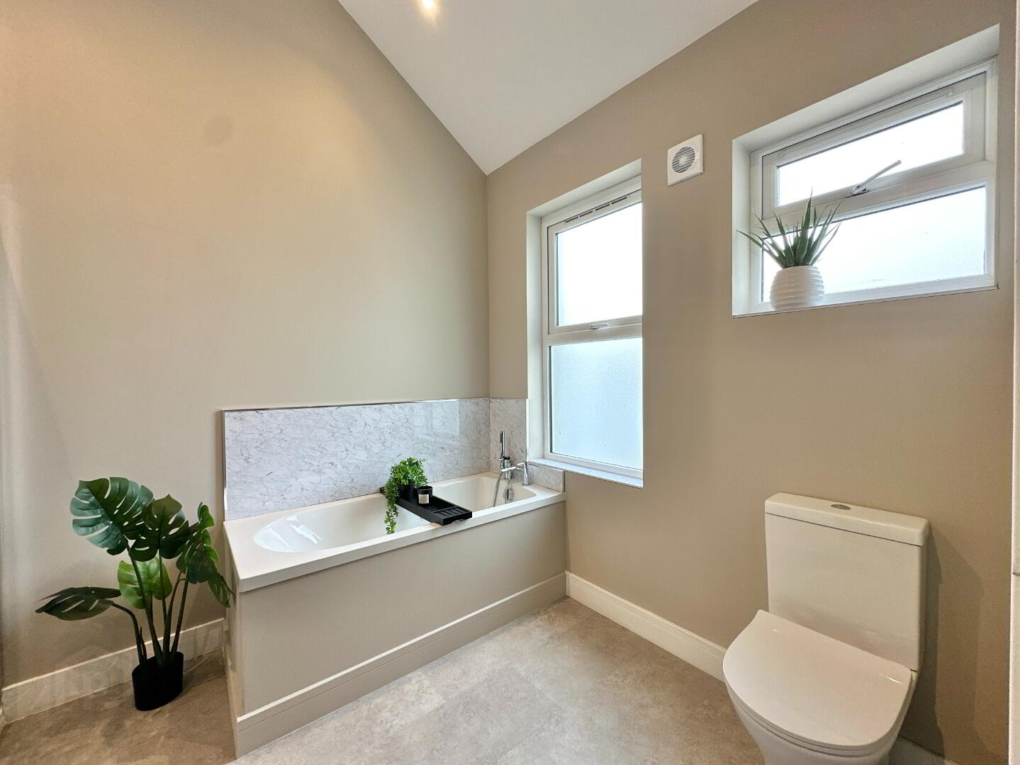 Family Bathroom 3.00m x 2.20m. New bathroom suite comprising of floating vanity wash hand basin, toilet, bath, thermostatic power shower, heated towel rail, spotlights, vaulted ceiling.