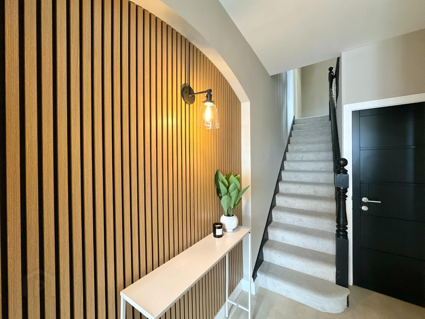 Entrance Hall 5.50m x 1.20m. Feature slated wall panelling, wall light, luxury vinyl tile flooring, stairway.