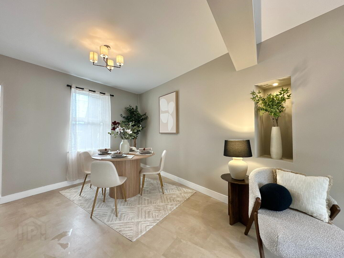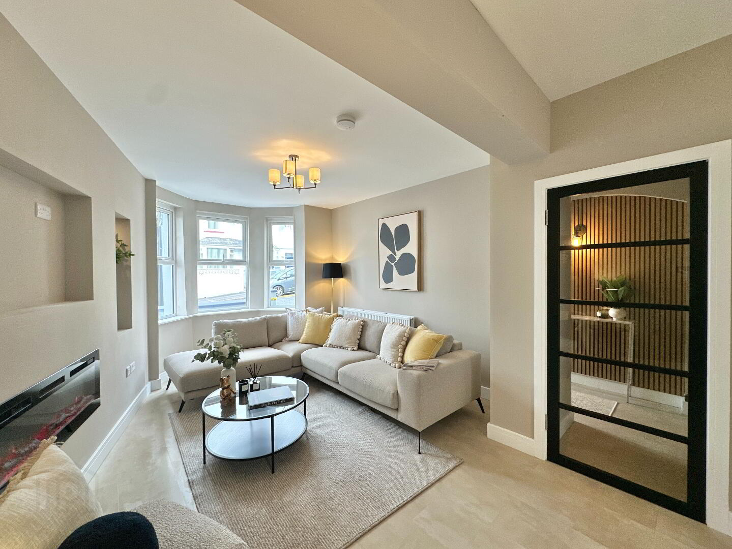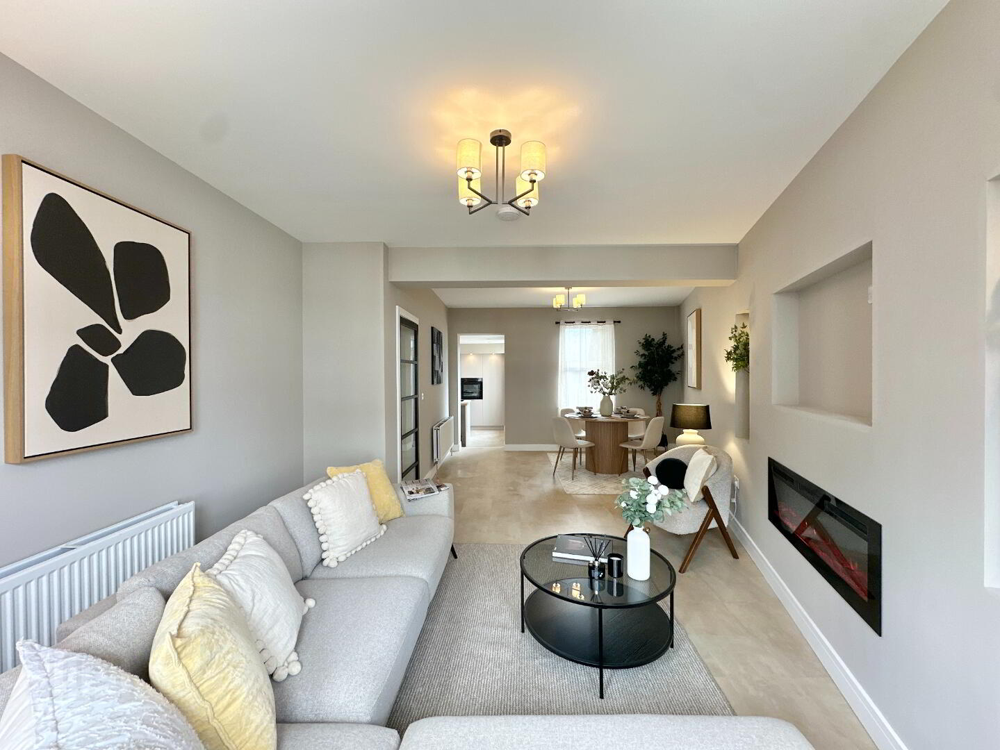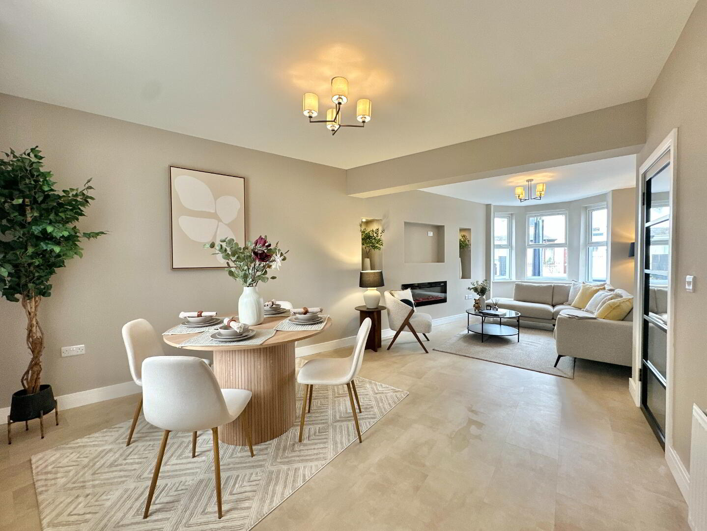 Living/Dining Area 8.00m x 4.00m. Bay window to front, Inset electric cassette fire, recessed niche shelves, luxury vinyl tile flooring., feature ceiling lights, 5 lite glazed door.