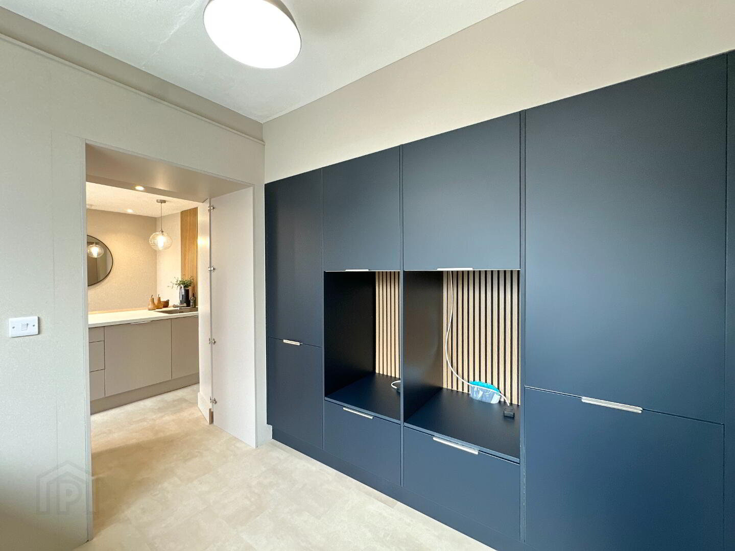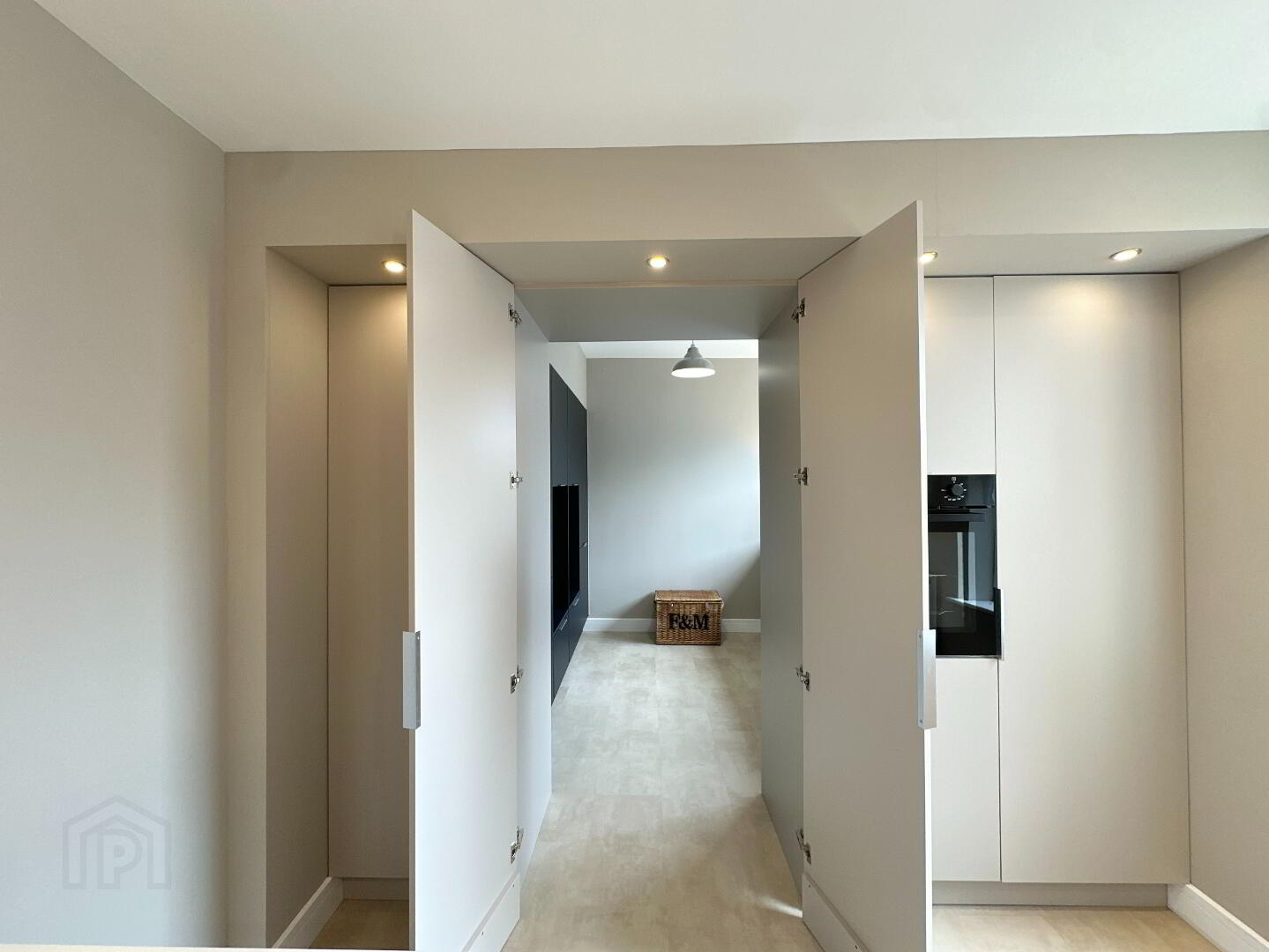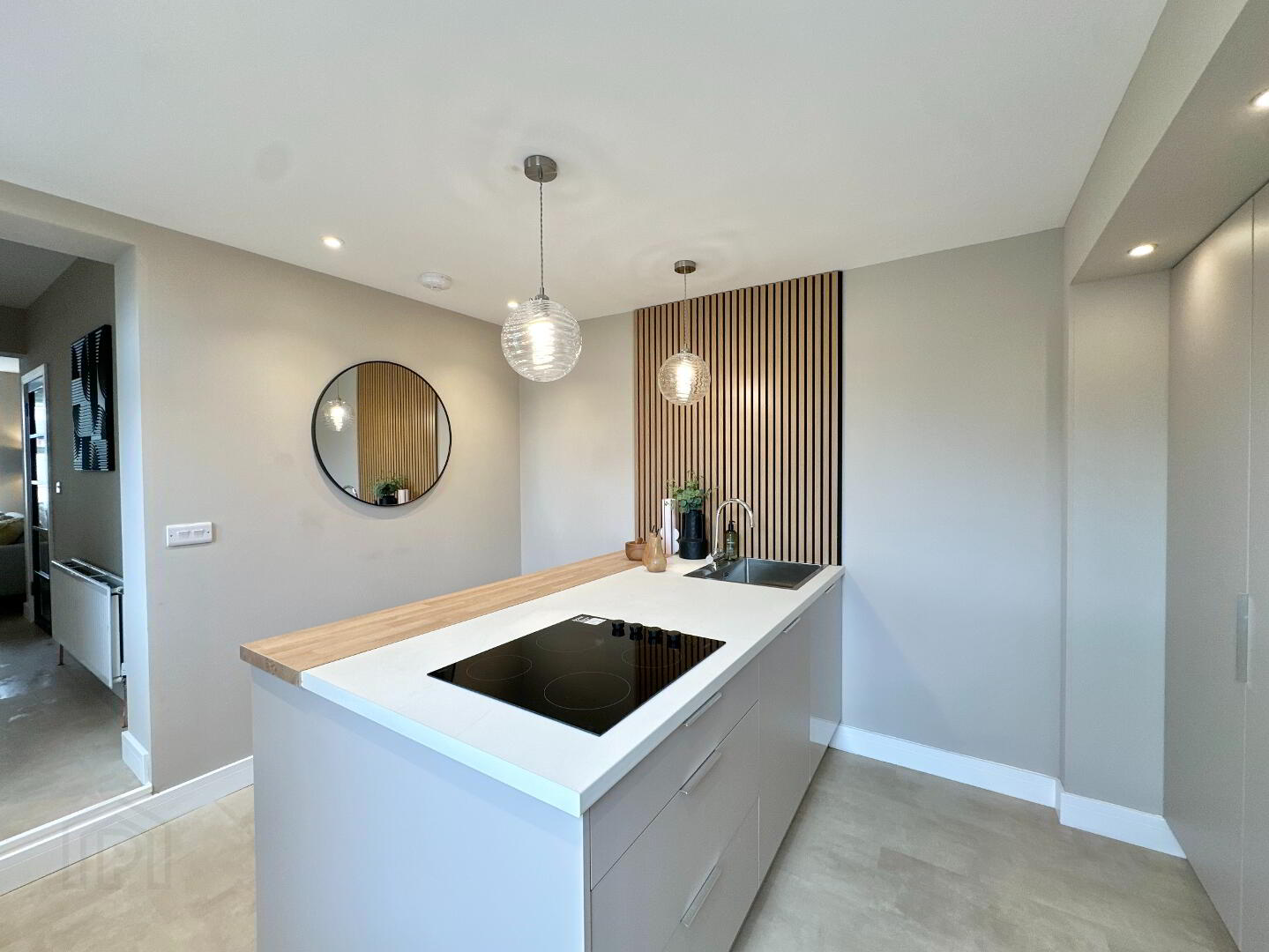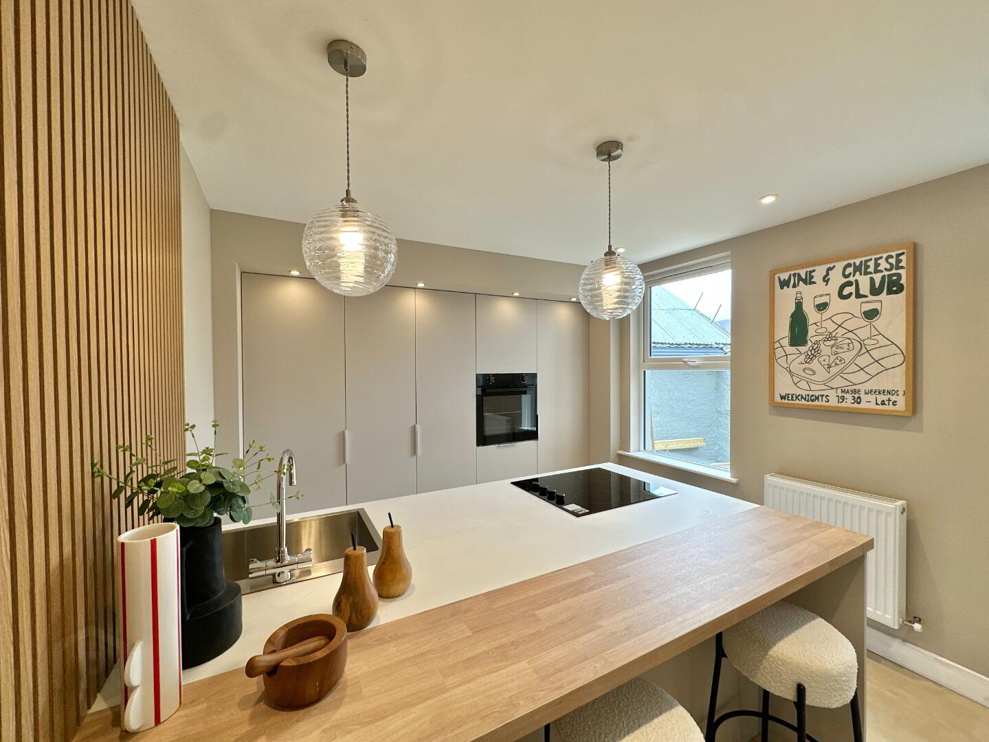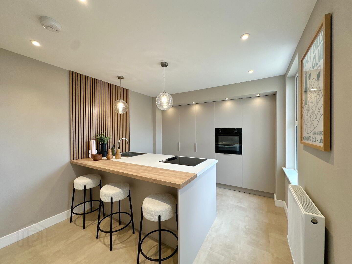 Kitchen 3.10m x 3.00m. Newly fitted matte modern kitchen – sleek and minimalist design, kitchen island with large Rangemaster stainless steel sink, integrated electric hob and breakfast bar seating, integrated eye level single oven, fridge freezer, dishwasher, feature panelling, pendant lights and feature spotlights, Luxury vinyl tile flooring.