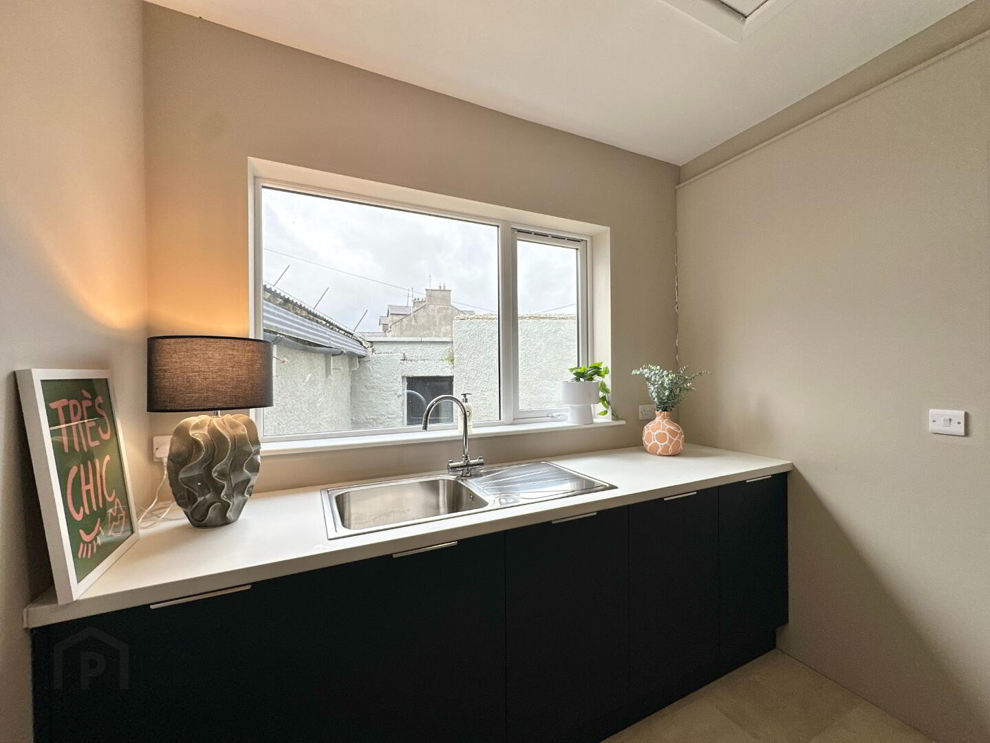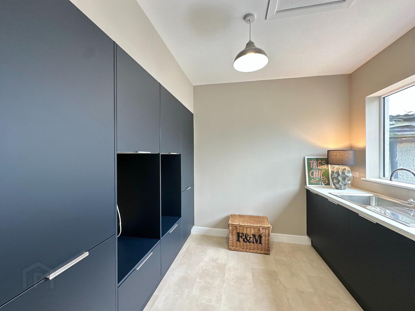 Utility Room 3.30m x 3.10m. Large sink, services for washer & dryer, selection of storage.
