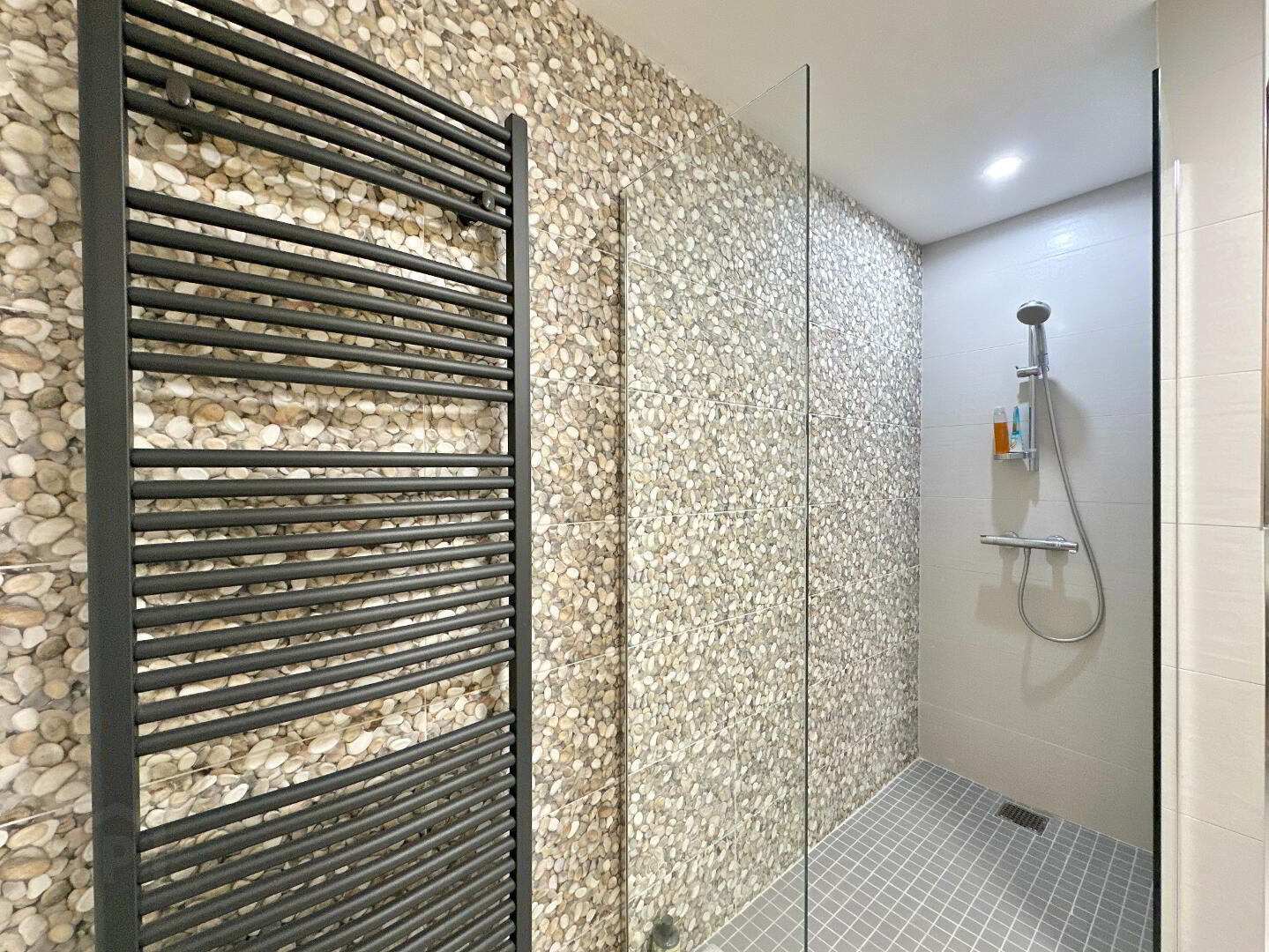 Bathroom 3.30m x 2.90m. Comprising of toilet, vanity unit, electric shower, heated towel rail, tiled floor and partially tiled walls. Access from hall and bedroom 1.