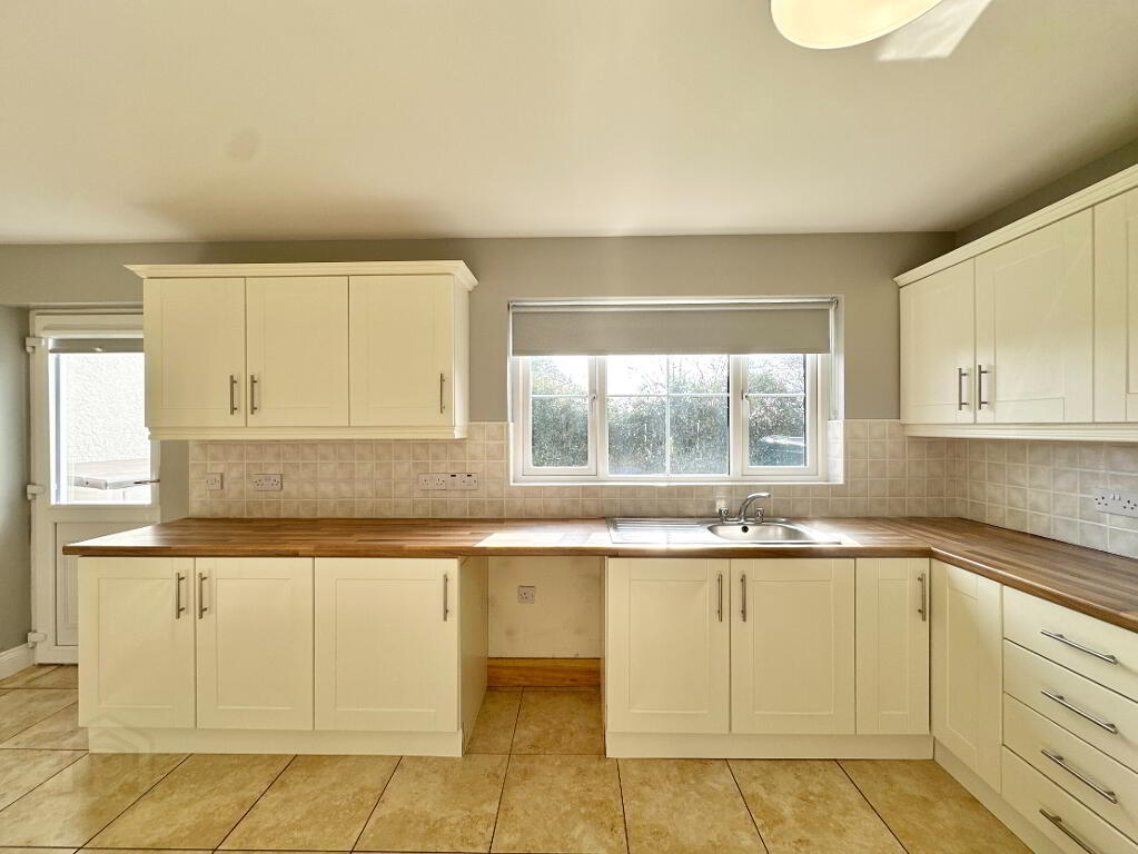 Kitchen/Dining 6.00m x 3.60m. Fitted kitchen with high and low level units, stainless steel sink, integrated fridge freezer, oven and hob, stainless steel extractor hood, service space for dishwasher/washing machine, T.V. Point, tiled floor, partially tiled walls.