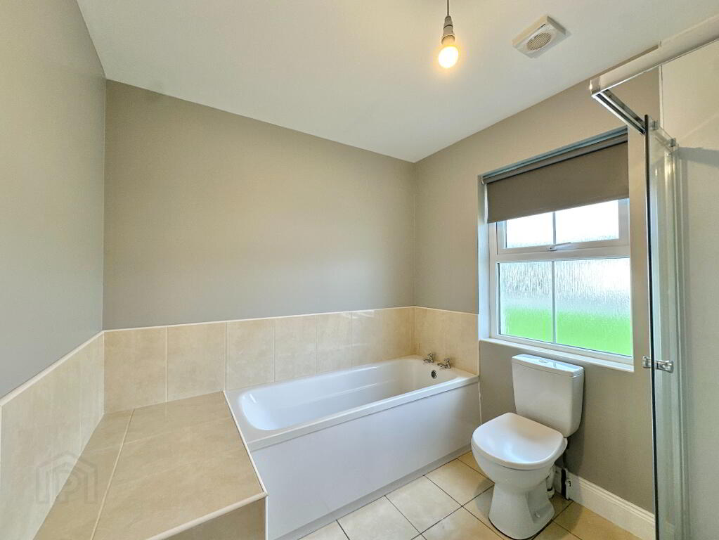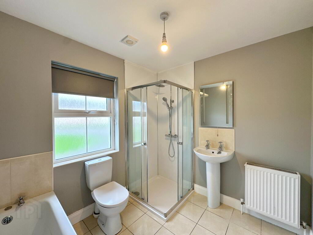 Bathroom 2.40m x 2.20m. Bathroom suite compromising of toilet, wash hand basin, power shower, tiled floor, partially tiled walls.