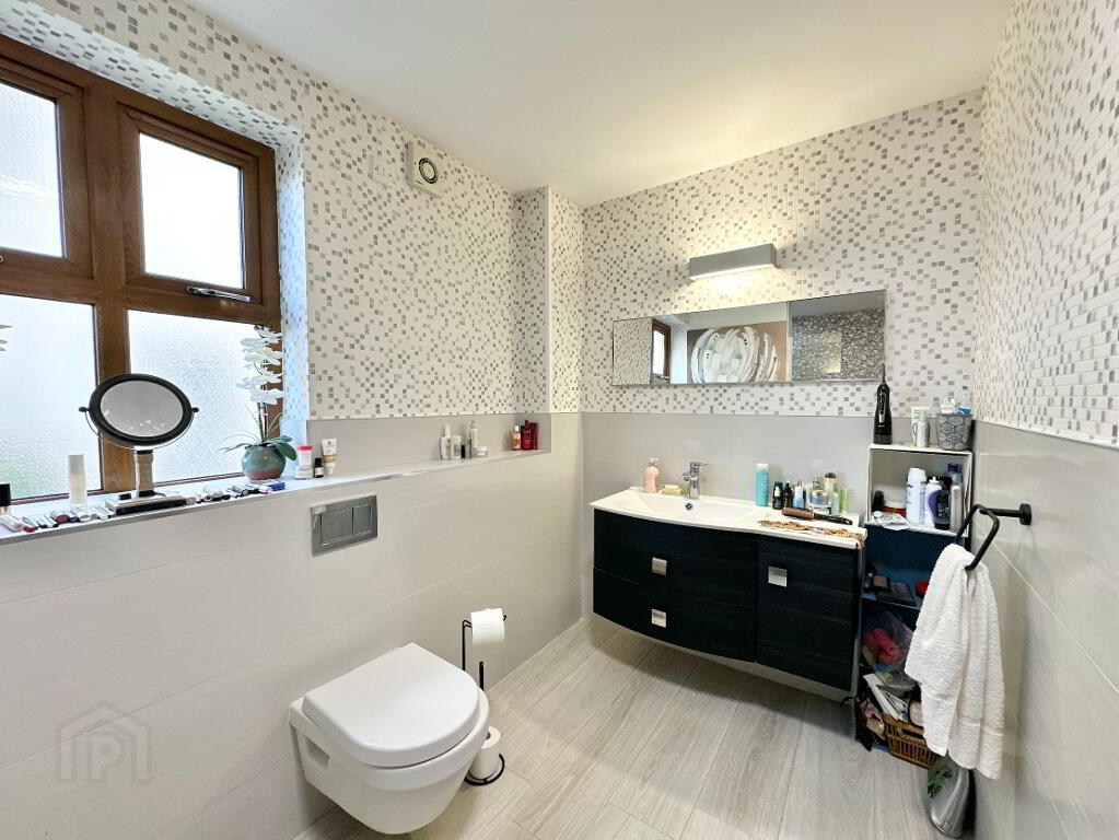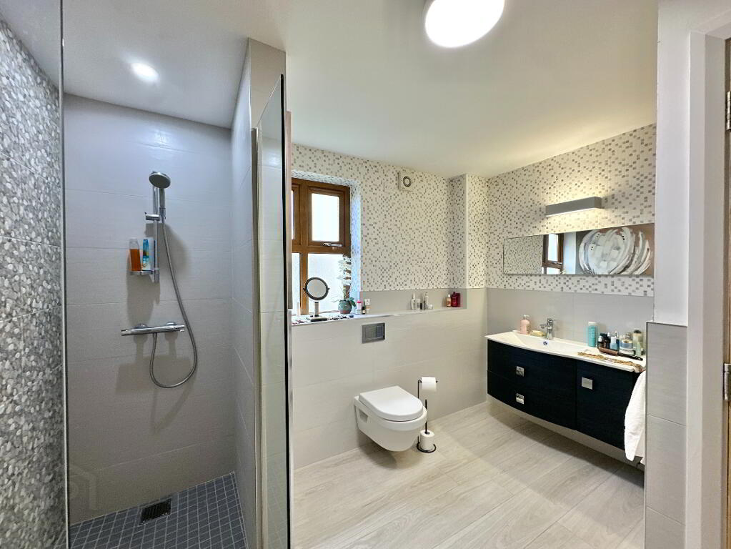 Bathroom 3.30m x 2.90m. Comprising of toilet, vanity unit, electric shower, heated towel rail, tiled floor and partially tiled walls. Access from hall and bedroom 1.
