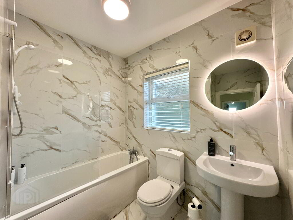 Family Bathroom 2.30m x 2.20m. Fully tiled bathroom suite comprising of toilet, wash hand basin, and shower over bath.