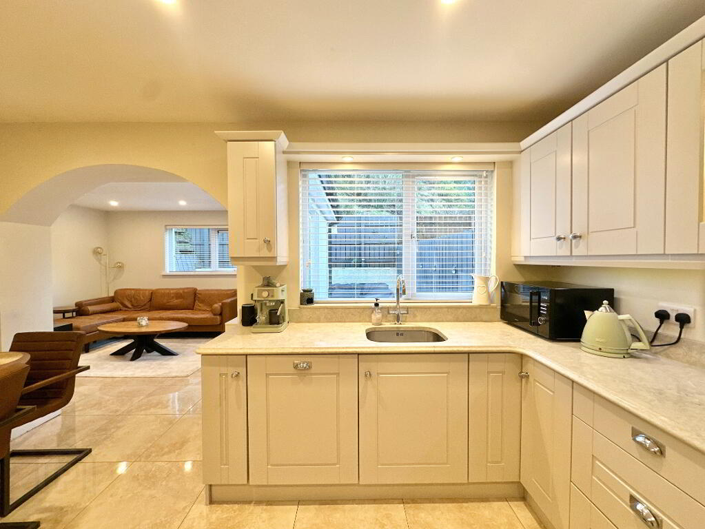 Utility Room 2.40m x 2.20m. High and low level units, stainless steel sink, Plumbed for washing machine, tiled floor.