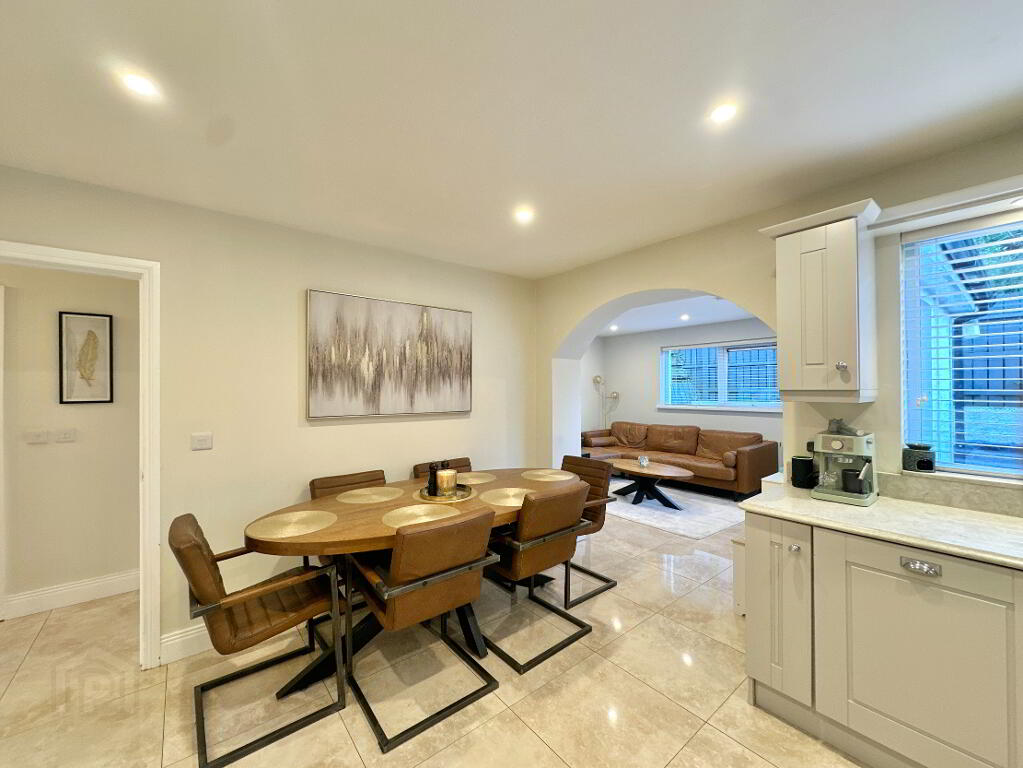 Kitchen / Dining Area 4.40m x 3.60m. Fully fitted modern kitchen with high and low level units, granite worktop, stainless steel sink, Integrated single oven, ceramic hob, extractor fan, fridge freezer, dishwasher, radiator cover, tiled floor.