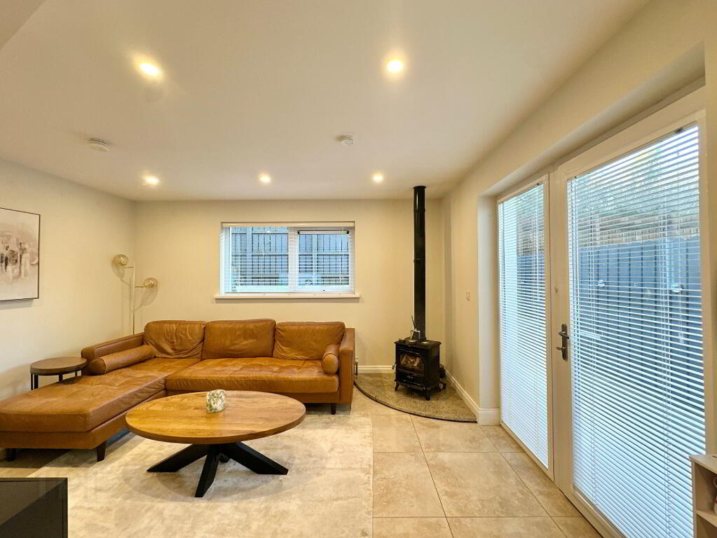 Open Plan Lounge Area 4.00m x 3.40m. Tiled floor, wood burning stove, T.V. Point, recessed lighting, patio doors.