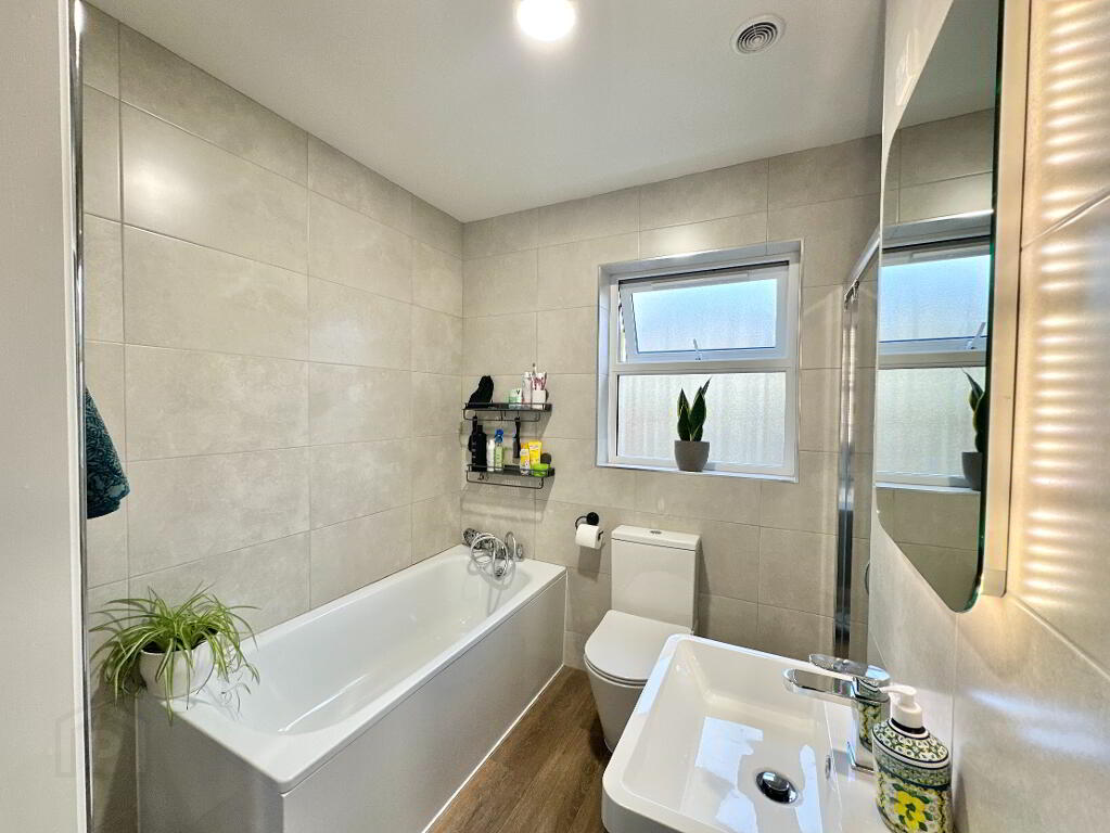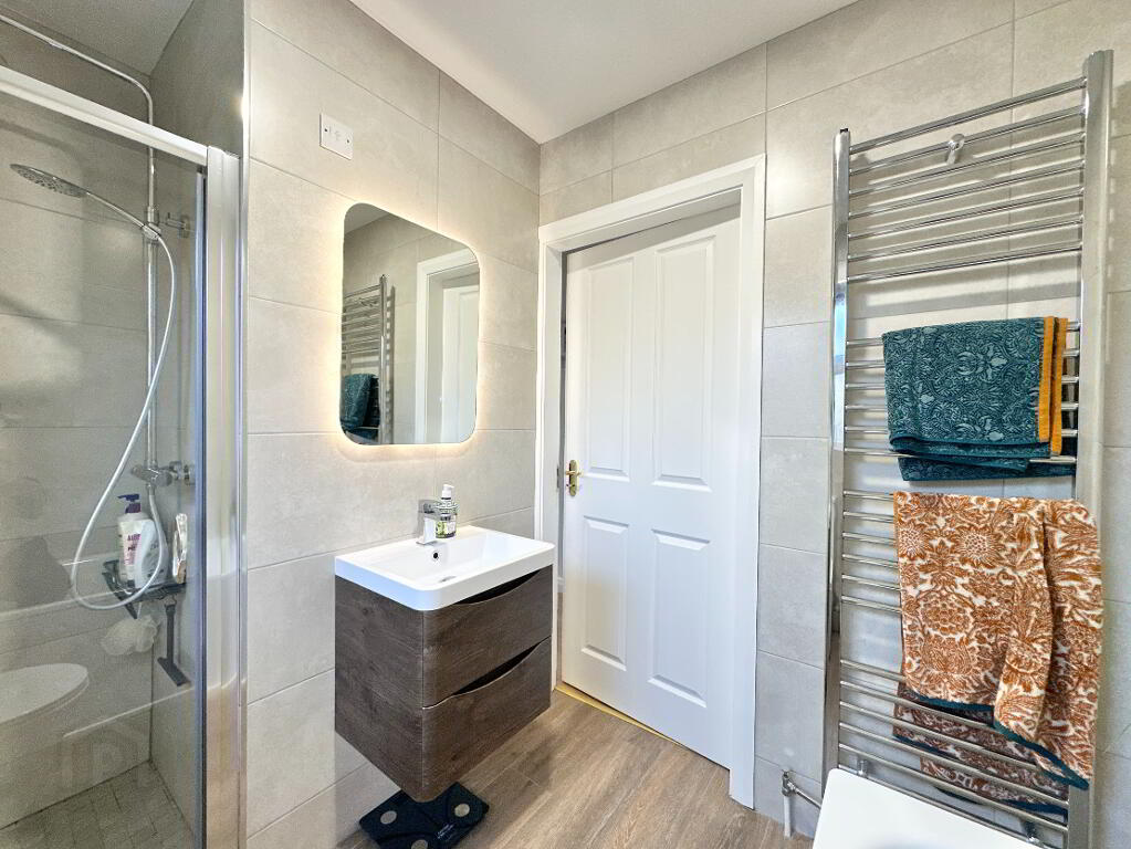 Bathroom 2.70m x 1.90m. Fully tiled bathroom suite comprising of toilet, wall hung vanity unit, walk in wet room power shower, LED back lit mirror.