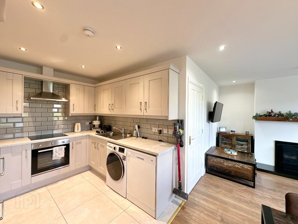 Open plan Kitchen/Dining/Living 6.10m x 5.60m. Fully fitted kitchen with high and low level units, stainless steel sink, integrated oven, hob, and fridge freezer, services for dishwasher and washing machine, tiled floor and laminate flooring, pendant and recessed lighting, bay window, wood burning stove, T.V point.