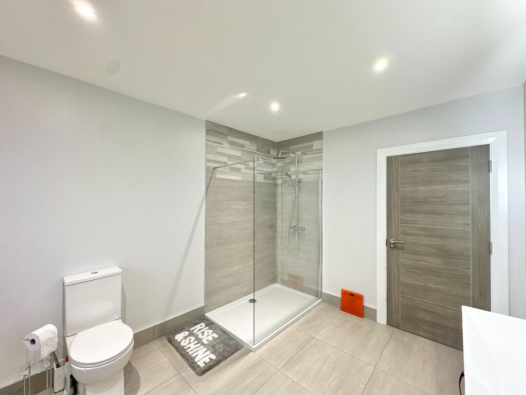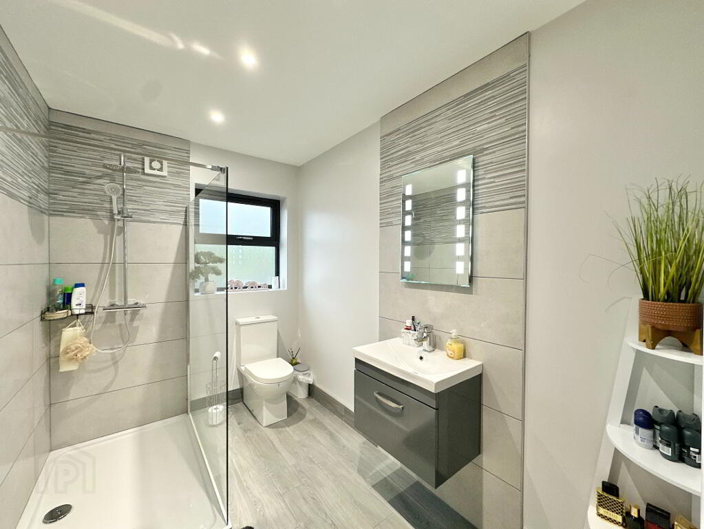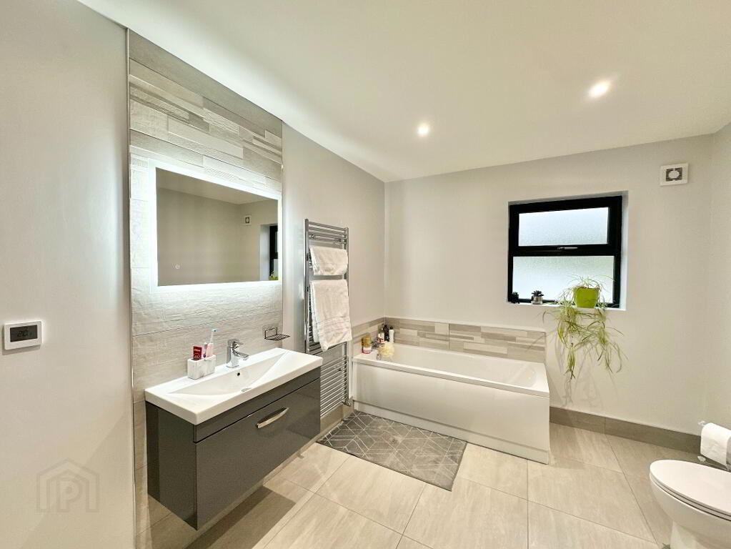 Family Bathroom 3.70m x 2.70m. Spacious bathroom suite comprising of toilet, wall hung vanity unit, bath, thermostatic power shower, heated towel rail, LED mirror, tiled floor, partially tiled walls.