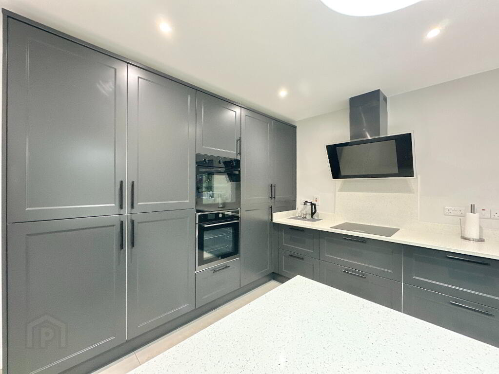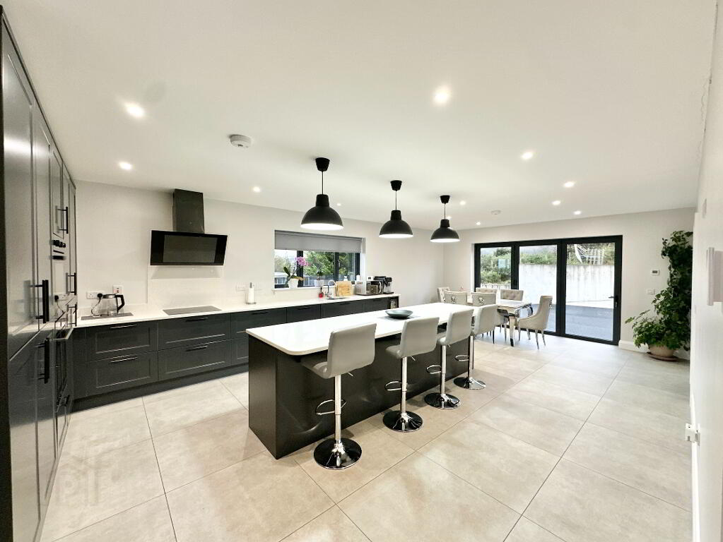 Kitchen/Dining Area 8.00m x 4.60m. Fully fitted modern kitchen with high and low level units and island, undermount sink, quartz worktop, integrated ceramic induction hob, extractor fan, double oven, dishwasher, fridge freezer, bi-fold sliding door leading to rear, tiled floor, recessed lighting.