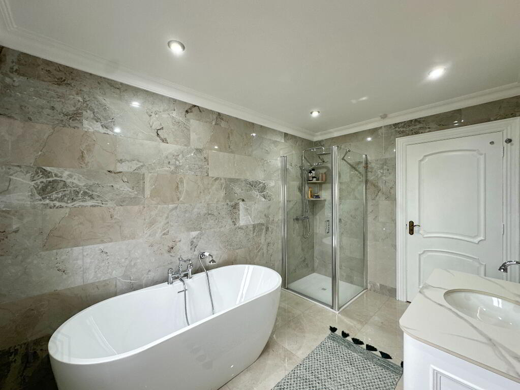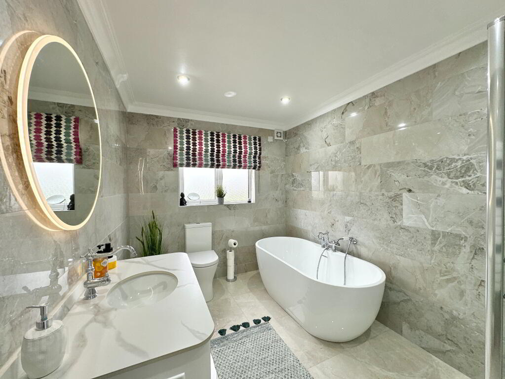 Family Bathroom 3.60m x 2.20m. Fully tiled bathroom suite comprising of toilet, vanity sink unit, freestanding bath, thermostatic power shower, heated towel rail, LED mirror.