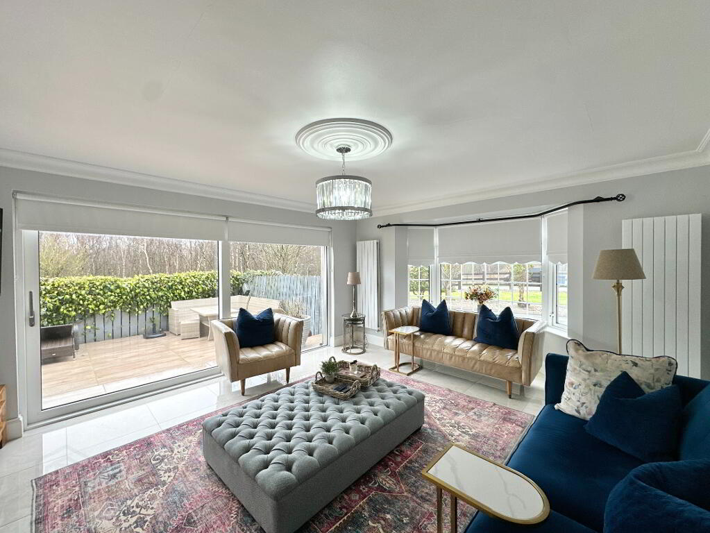 Living Room 2 4.80m x 4.40m. Tiled floor, bay window, wall panelling, coving, T.V. Point, Sliding patio doors to rear.
