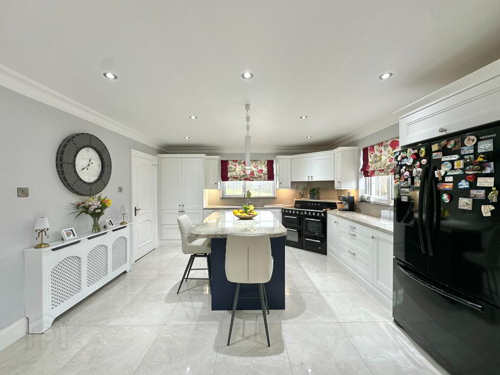 Kitchen/Dining Area 4.70m x 4.30m. Fully fitted modern kitchen with high and low level units and island, undermount sink, granite worktop, Smeg range cooker inclusive of 5 ring induction hob and four ovens, integrated extractor fan, dishwasher, fridge freezer, tiled floor, recessed lighting.