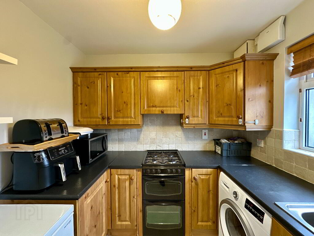 Utility Room 2.40m x 2.40m. High and low level units, stainless steel sink, Gas oven and hob, Plumbed for washing machine and tumble dryer.