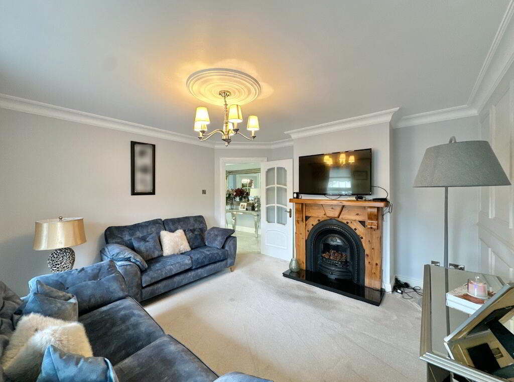 Living Room 1 4.10m x 4.00m. Carpet, gas open fire, wall panelling, coving, T.V. Point.
