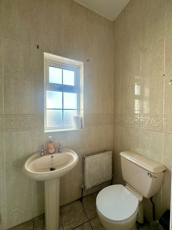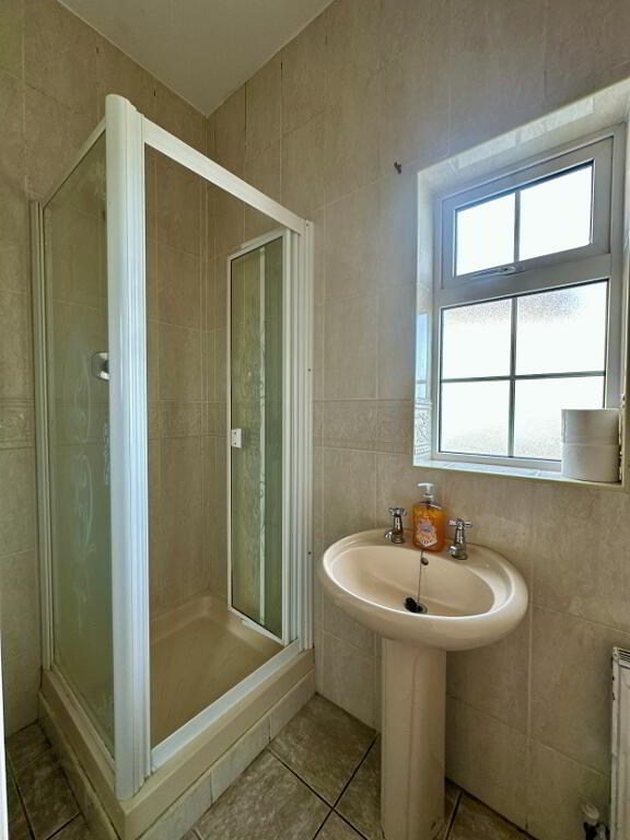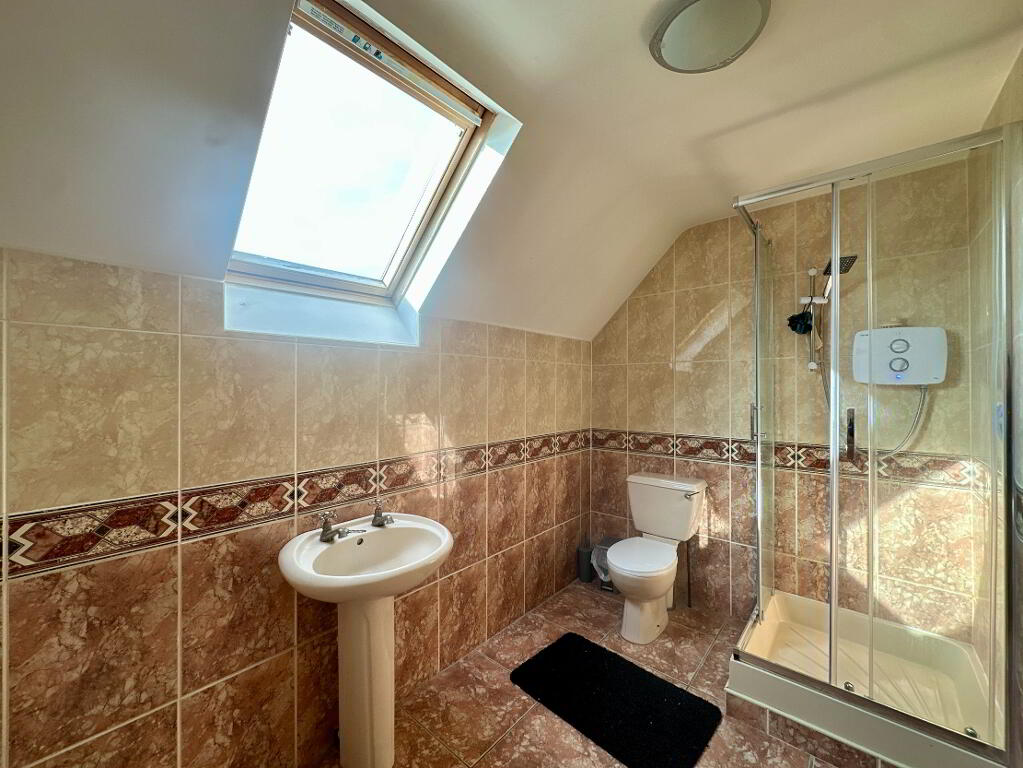 Family Bathroom 3.00m x 1.80m. Fully tiled bathroom suite comprising of toilet, wash hand basin, electric shower.