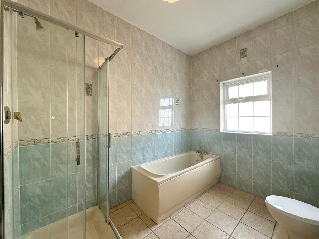 Family Bathroom 4.00m x 2.20m. Fully tiled bathroom suite comprising of toilet, wash hand basin, power shower and bath.