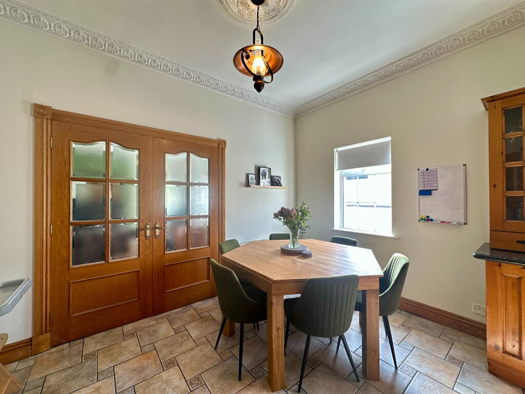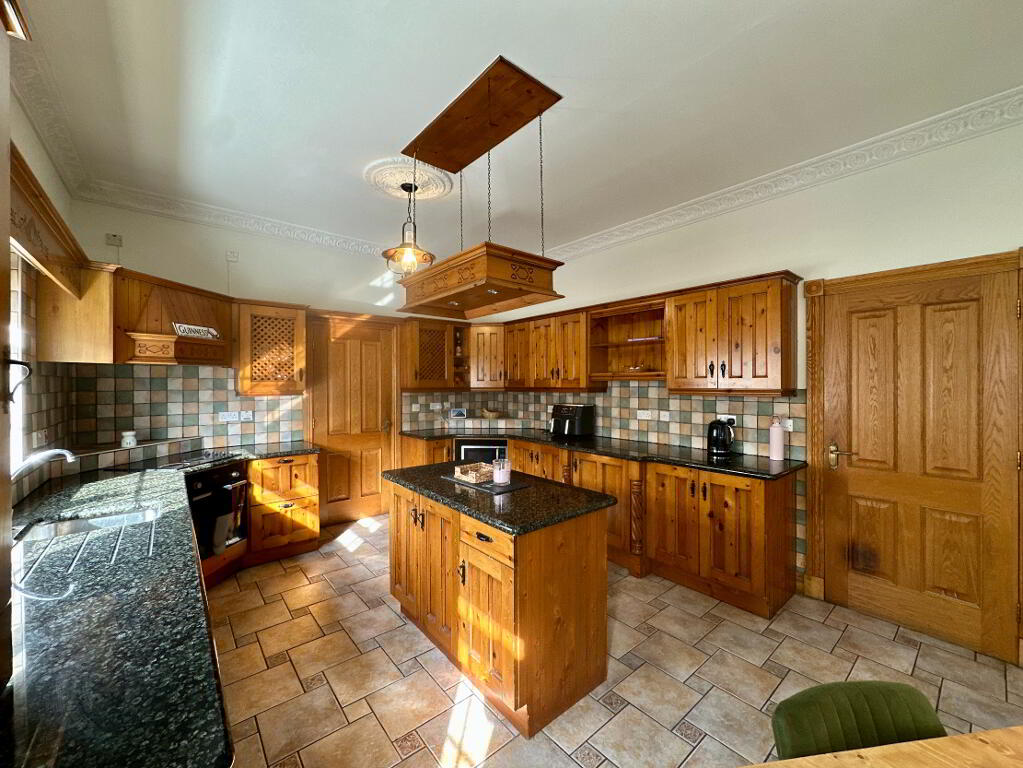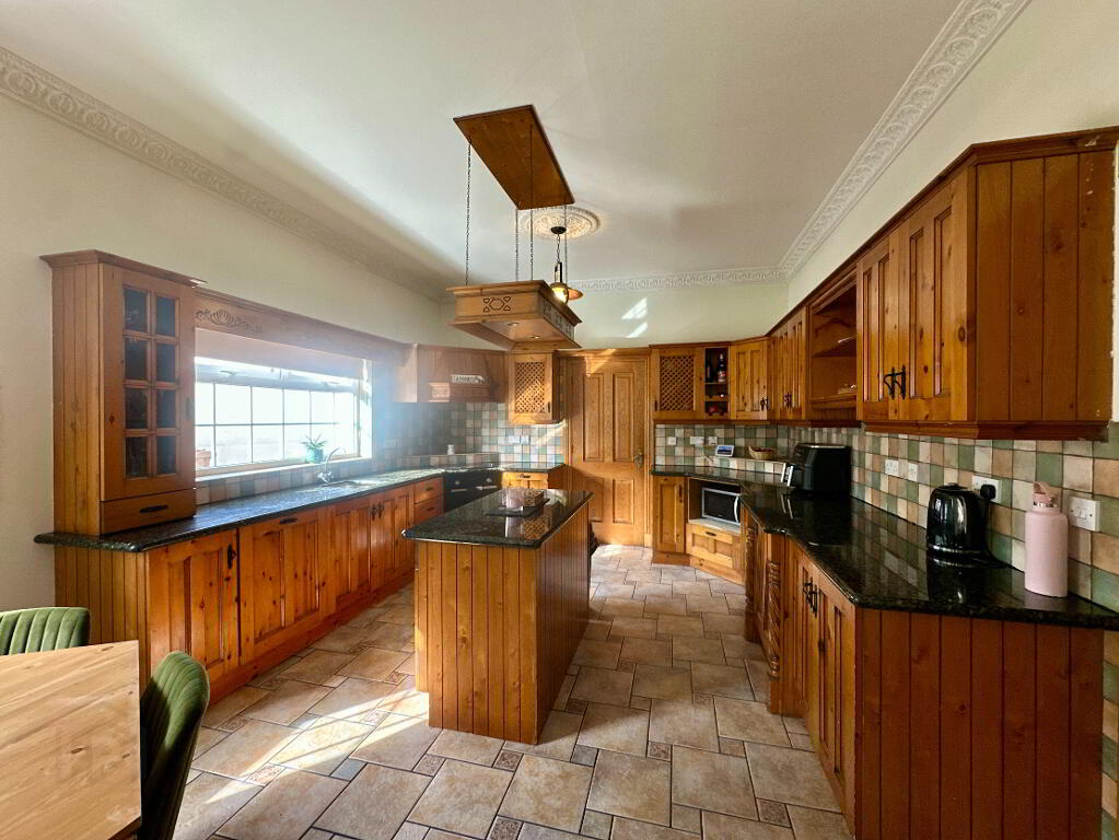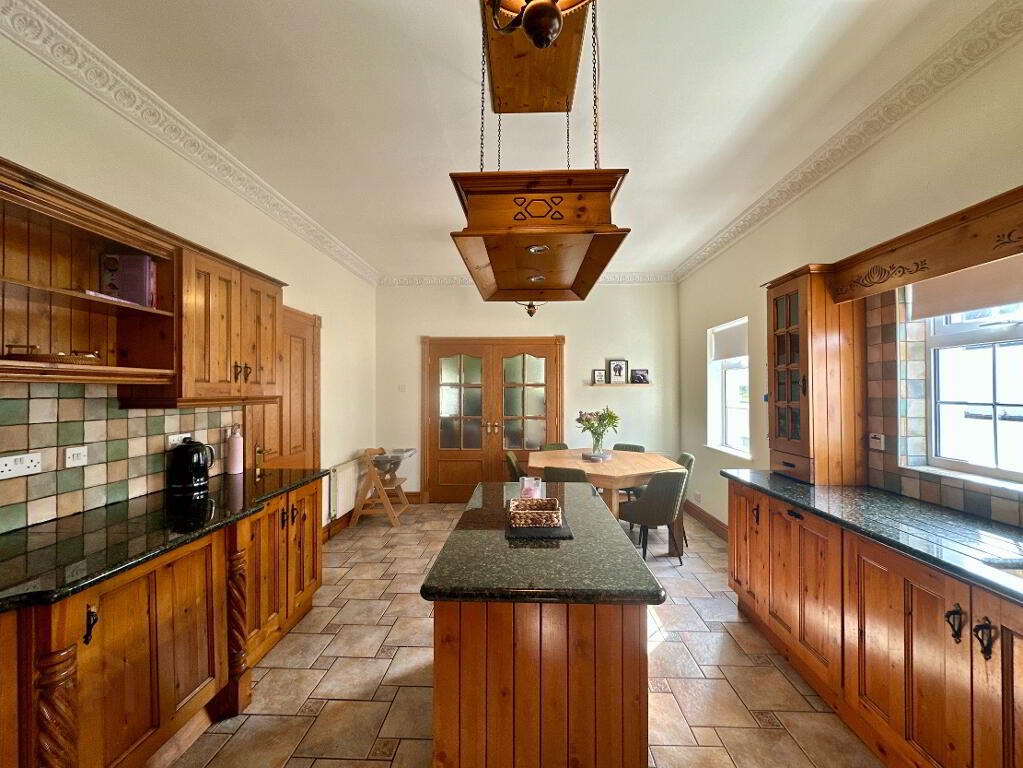 Kitchen/Dining Area 6.0m x 3.80m. Fully fitted kitchen with high and low level units and island, undermount sink, granite worktop, integrated single oven, ceramic hob, dishwasher, fridge, microwave, tiled floor, partially tiled walls, coving.