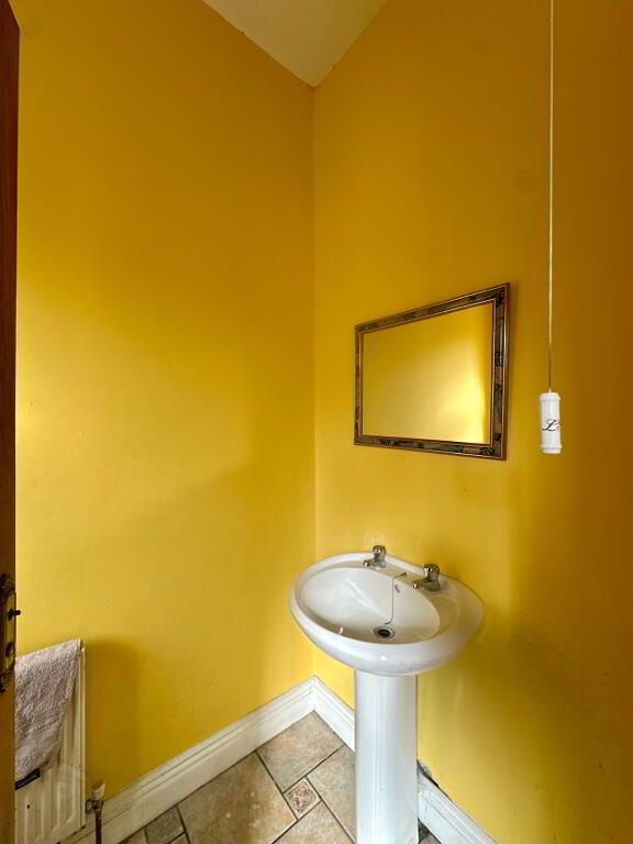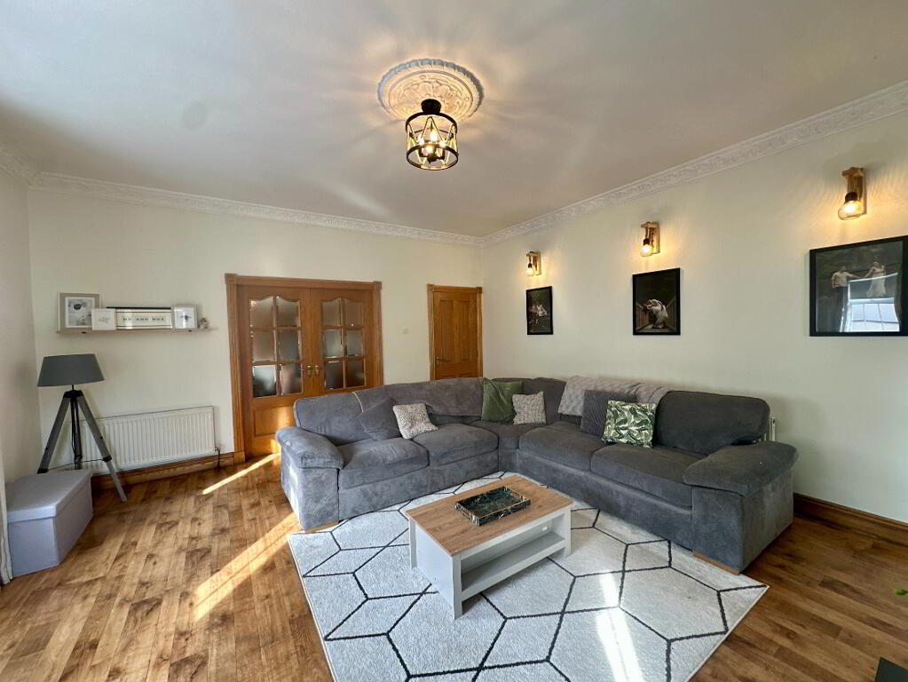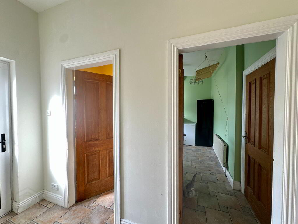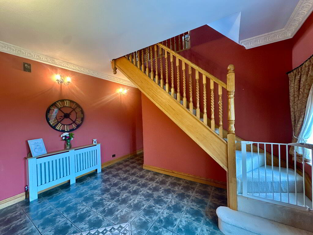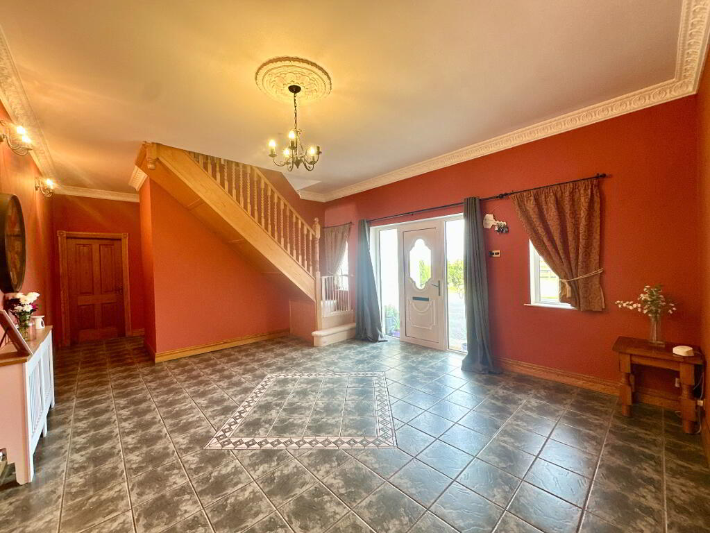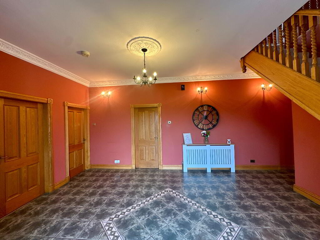 Hall 5.30m x 4.50m. Tiled floor, coving, radiator covers.