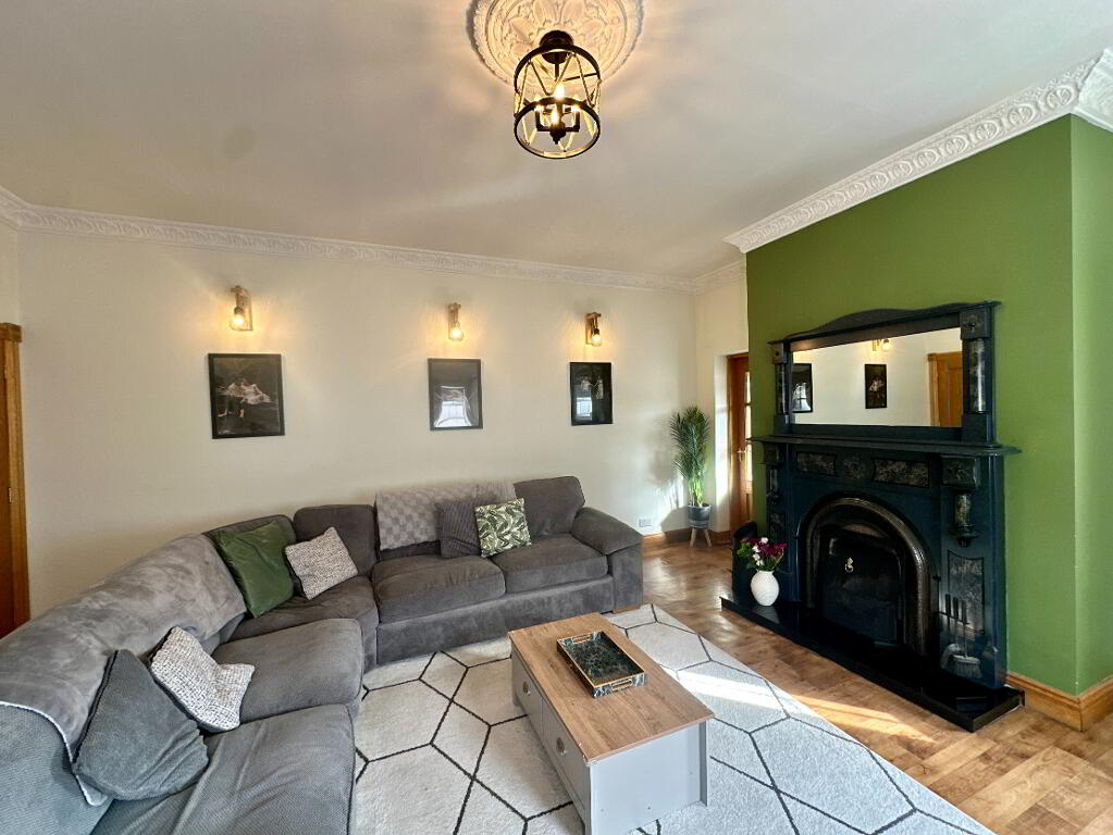 Living Room 1 5.50m x 5.00m. Lino, coving, marble fireplace with open fire.